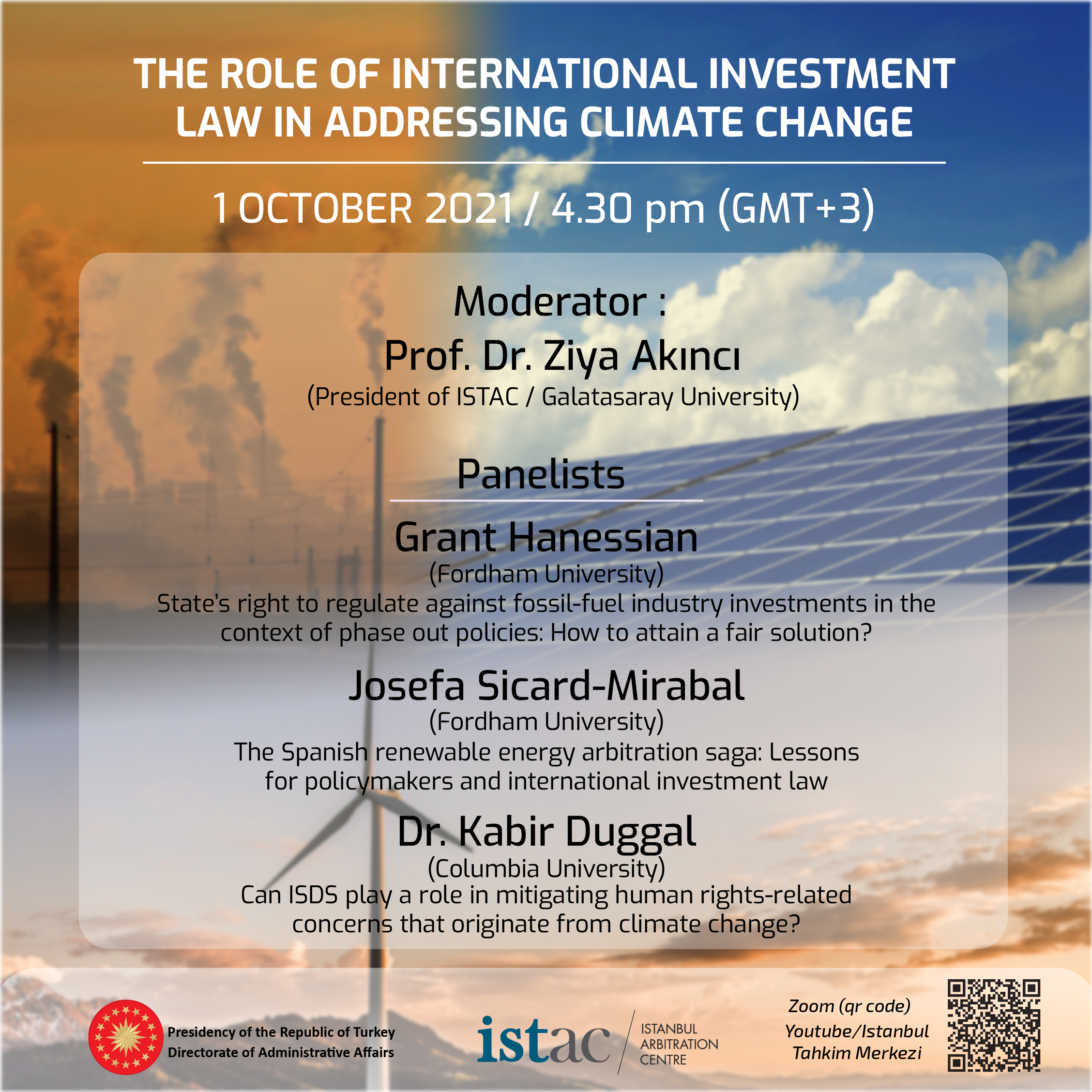 In this context, the Presidency of Turkey Directorate of Administrative Affairs and ISTAC are delighted to co-organise a panel through which distinguished experts will seek to explore the role of investor-state dispute settlement (ISDS) in mitigating the adverse effects of climate change. The Panel will be held on 1 October 2021 at 16.30 (GMT+3) on Zoom and Youtube (İstanbul Tahkim Merkezi account).